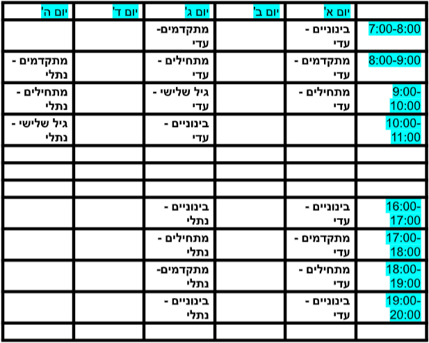 אנו עובדים בקבוצות קטנות ואינטימיות של בערך 8–4 משתתפים בקבוצה. קבוצות קטנות מאפשרות יחס אישי מכל מדריך/ה, תשומת לב לטכניקה של כל מתאמן, והרגשה של שיעור פרטי באווירה קבוצתית. אף אחד לא "הולך לאיבוד" אצלנו בקבוצה – יש מקום לשאלות, להתאמות ולדגש אישי לכל משתתף.